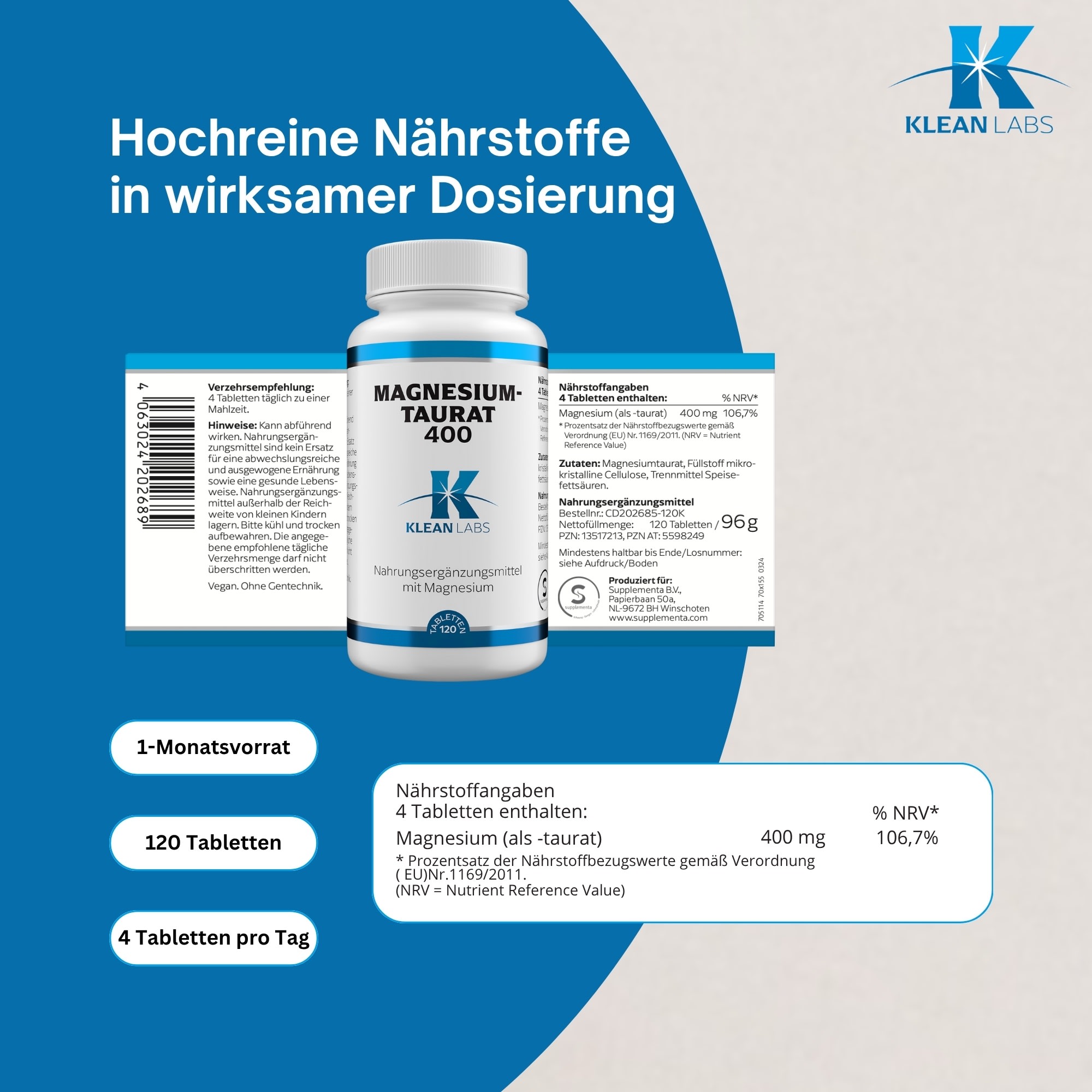 4 Tabletten enthalten: % NRV* Magnesium (als -taurat) 400 mg 106,7%