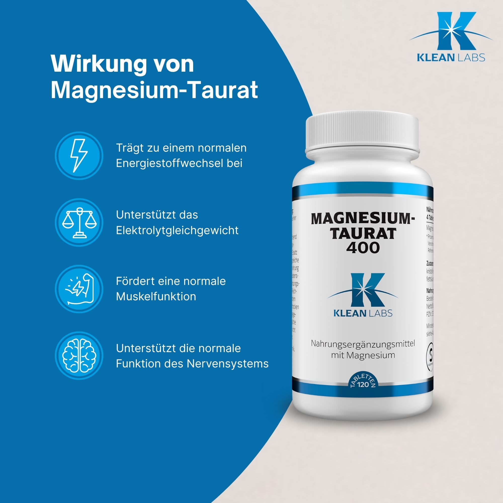 Magnesium-Taurat 400 von Klean Labs: Hochbioverfügbares Magnesium für Nerven, Muskeln und Energie