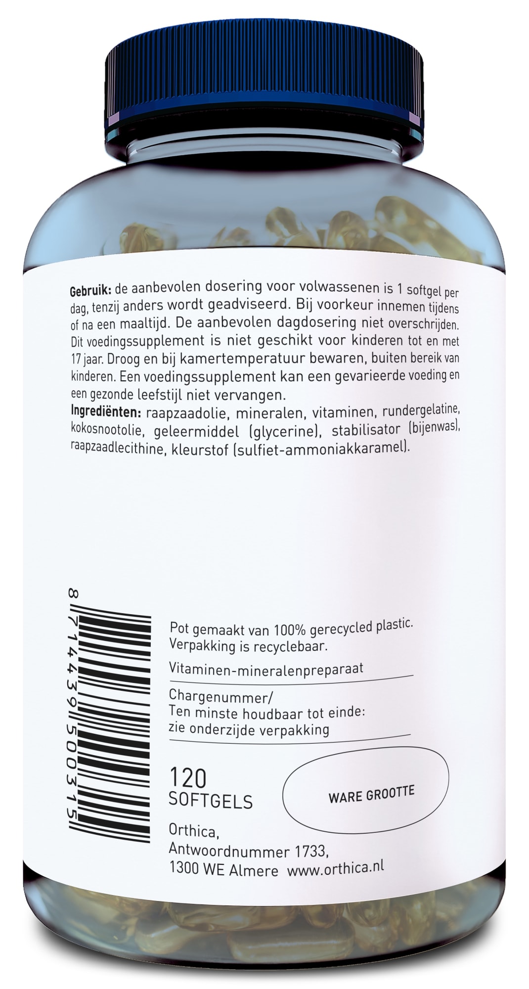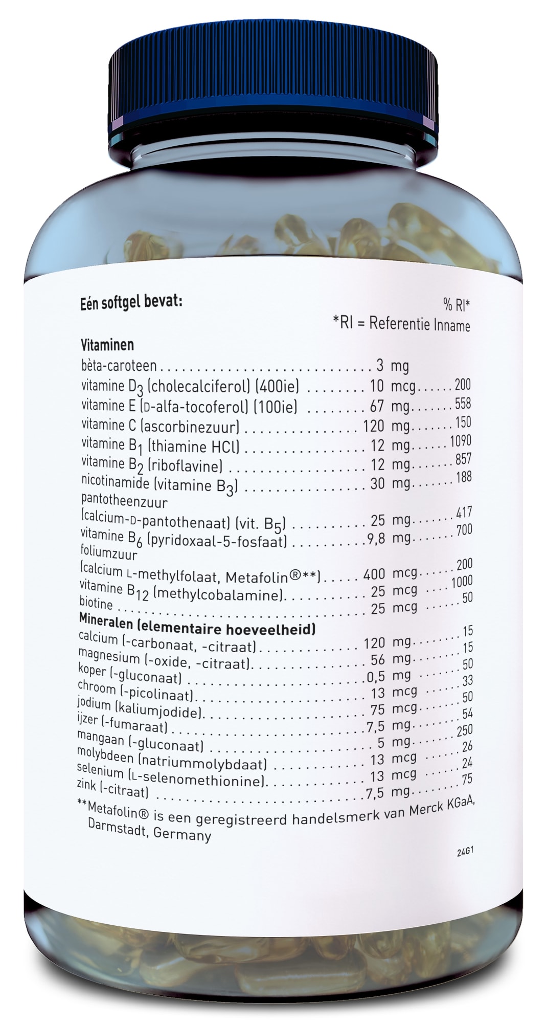 Rapsöl, Kapselhülle Gelatine (Rind), Calciumcarbonat, Kokosnussöl, Geliermittel Glycerin, L-Ascorbinsäure, D-Alpha-Tocopherol, Magnesiumoxid, Stabilisator Bienenwachs, Mangangluconat, Rapslecithin, Nicotinamid, Calcium-Pantothenat, Zinkcitrat, Eisenfumarat, Calciumsalze der Citronensäure, Thiaminhydrochlorid, Pyridoxal-5-Phosphat, Magnesiumsalze der Citronensäure, Riboflavin, Beta-Carotin, Farbstoff Ammoniak-Zuckerkulör, Kupfergluconat, Methylcobalamin, Selenomethionin, Calcium-L-Methylfolat, Cholecalciferol, Kaliumjodid, Chrompicolinat, Natriummolybdat, Biotin, .